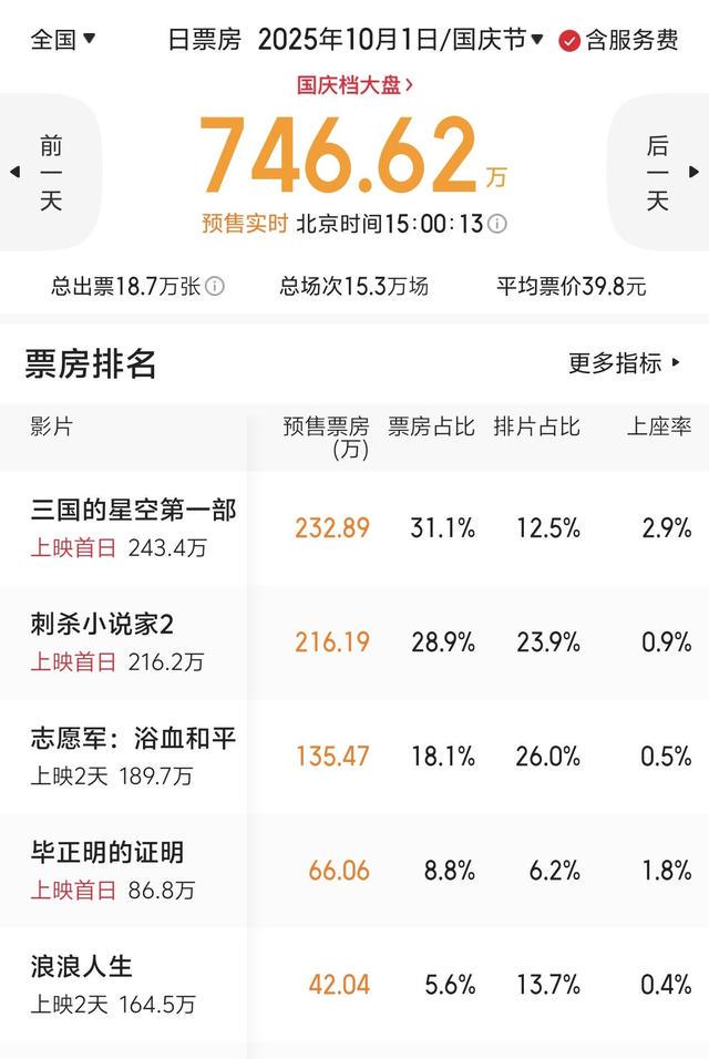 猫眼专业版数据显示,截至9月24日15点,电影《三国的星空第一部》10月1日国庆节当天的票房超243万,领跑国庆节预售票房榜。